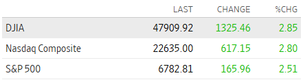 INDICES BURSATILESWall Street cerró con fuertes ganancias el 8 de abril de 2026, impulsado por el optimismo de un alto el fuego entre Estados Unidos e Irán. El Dow Jones subió un 2.85% (47,909.92 puntos), el S&P 500 avanzó un 2.51% (6,782.81 unidades) y el Nasdaq Composite ganó un 2.8% (22,635.00 puntos), marcando una jornada de rebote generalizado tras la disminución de tensiones. |