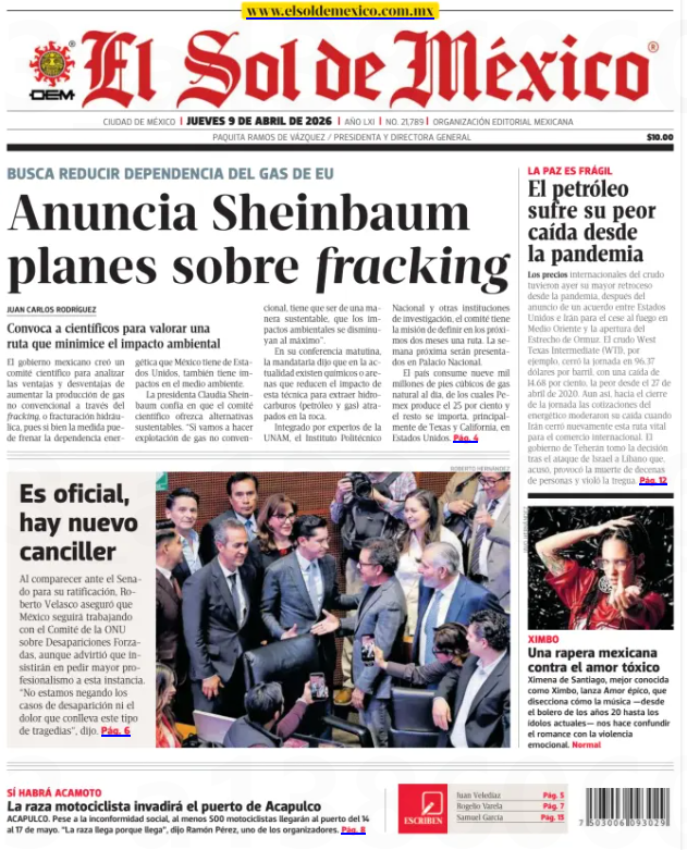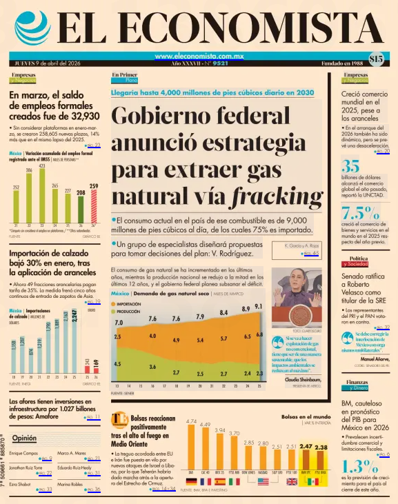 México apostaría a gas de yacimientos no convencionales El planteamiento está encaminado a reducir la dependencia de las importaciones. México podría elevar su producción de gas natural hasta 260 por ciento hacia 2035 mediante el desarrollo de yacimientos no convencionales, pero sería hasta dentro de unos dos meses que un Comité emita sus observaciones cuando inicie el proceso. La presidenta Claudia Sheinbaum señaló que la explotación de estos recursos permitiría reducir la dependencia de importaciones, que actualmente cubren cerca de 75 por ciento del consumo, y sostener el crecimiento de la demanda vinculado a nuevos proyectos industriales. “Nosotros tenemos una buena relación con el gobierno de Estados Unidos y tenemos garantizados los contratos de gas natural de importación, pero es una decisión responsable aumentar nuestra soberanía energética”, indicó. https://www.elfinanciero.com.mx/economia/2026/04/09/mexico-apostaria-a-gas-de-yacimientos-no-convencionales/ |