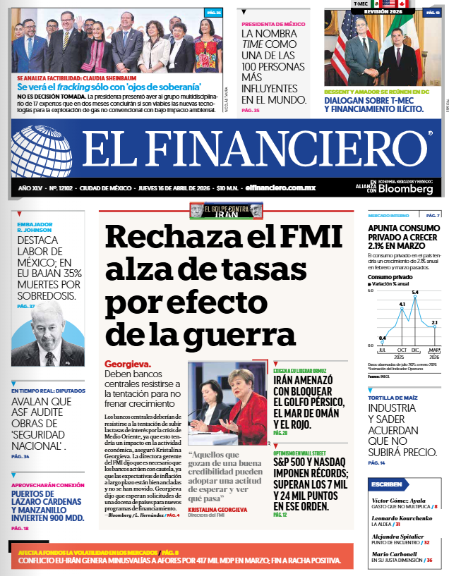 Ahí te hablan, Banxico: FMI pide no subir tasas de interés por guerra en Irán Kristalina Georgieva, directora del FMI, pidió ‘cautela’ a los bancos centrales de todo el mundo pues si se apresuran a adoptar una postura restrictiva, podrían desacelerar aún más a la economía global. El Fondo Monetario Internacional (FMI) tiene un ‘mensaje’ para el Banco de México (Banxico): Los bancos centrales deben resistirse a la tentación de subir las tasas de interés en respuesta a la guerra en Medio Oriente, ya que esto podría tener un impacto en el crecimiento del PIB. Dado que las expectativas de inflación a largo plazo están bien ancladas y no se han movido, “es importante que los bancos centrales actúen con cautela”, declaró Kristalina Georgieva, directora del FMI, a Bloomberg Television. https://www.elfinanciero.com.mx/economia/2026/04/15/fmi-pide-a-bancos-centrales-no-subir-tasa-de-interes-por-guerra-en-iran/ |