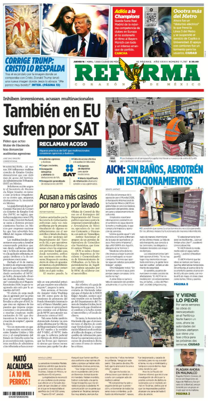 REFORMATambién en EU sufren por SAT Al menos 300 influyentes multinacionales de EU denunciaron que son víctimas de acoso del SAT en México; solicitaron acción urgente. https://www.reforma.com/tambien-en-eu-sufren-por-sat/ar3187361?v=4 |