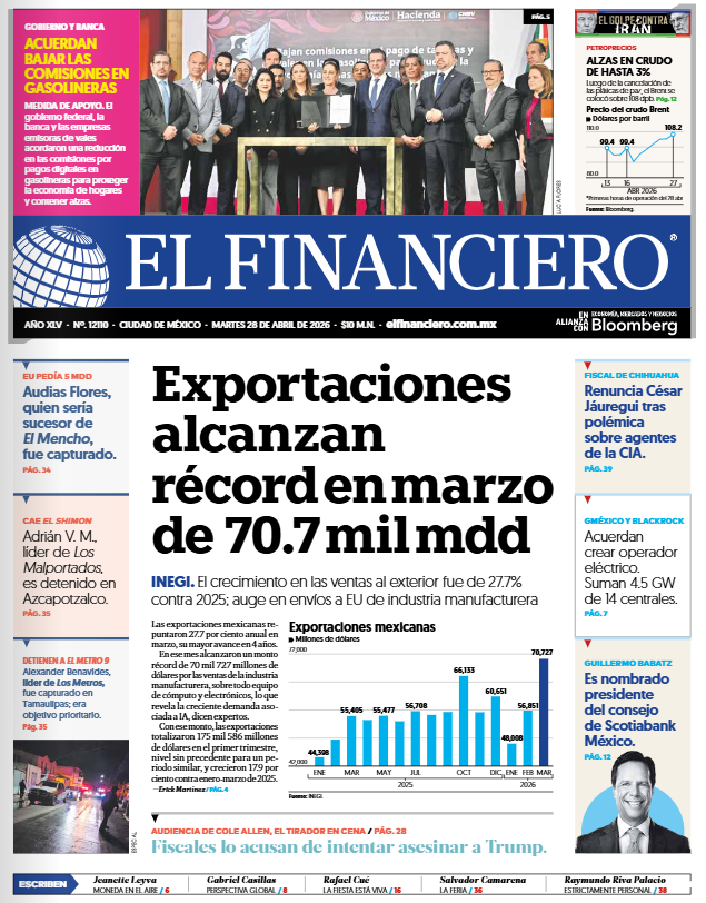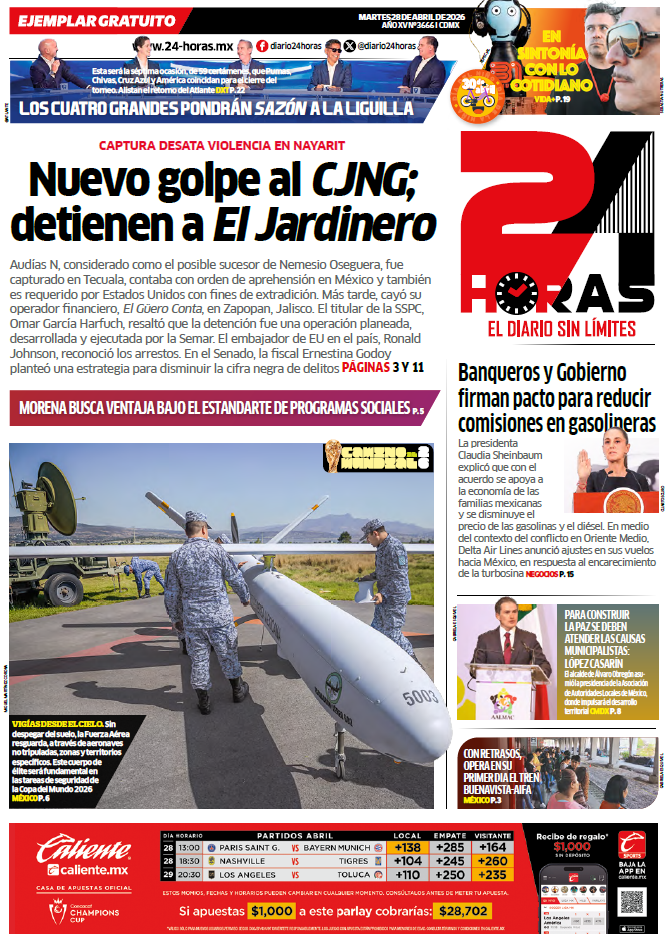 CLAUDIA SHEINBAUM ANUNCIÓ QUE BAJARÁN COMISIONES POR PAGAR CON TARJETA EN GASOLINERAS Importante anuncio hizo la presidenta Claudia Sheinbaum, pues informó que bajarán las comisiones al pagar con tarjetas de crédito y débito en las gasolineras del país. La medida se suma a los precios ‘tope’ de los combustibles con el objetivo de reducir la inflación en México. Para ello se establecerán tres acuerdos principales, que son: Descuento en las comisiones que se cobran en el uso de tarjetas bancarias, descuento en las comisiones que se cobran por la recepción de vales. Lo que iniciará a partir del 1 de mayo al 31 de octubre. Por otra parte, la presidenta Sheinbaum se pronunció sobre la comisión creada por Maru Campos, gobernadora de Chihuahua, para investigar la muerte de dos agentes de Estados Unidos en la entidad. “Ella se comprometió a seguir avanzando y hasta después informó que creó una unidad de investigación sobre el tema. O fue la fiscalía o fue el gobierno de Chihuahua, no hay de otra. No hay muchas más opciones”, puntualizó. Sheinbaum adelantó que será el gabinete de Seguridad el encargado de informar sobre los avances en dichas investigaciones. “Vamos a esperar qué dice la gobernadora, mientras tanto es importante que se proceda en este sentido e iremos informando”, agregó la mandataria. LAURA ITZEL CASTILLO, PRESIDENTA DEL SENADO CONFÍA EN QUE GOBERNADORA DE CHIHUAHUA ASISTA AL SENADO DE LA REPÚBLICA ESTE MARTES La presidenta de la Mesa Directiva, Laura Itzel Castillo Juárez, confió en que la gobernadora de Chihuahua, María Eugenia Campos Galván, y el titular de la Fiscalía General del Estado, César Gustavo Jáuregui Moreno, acudan al Senado para informar sobre los hechos en los que perdieron la vida dos personas de nacionalidad estadounidense en dicha entidad federativa. “Hubo una invitación por parte del Senado de la República que se aprobó en el Pleno, entonces estamos esperando que acuda, al igual que el fiscal; seguramente van a acudir”, expresó la senadora en entrevista, luego de la ceremonia de Toma de Protesta de la Presidencia de la Asociación de Autoridades Locales de México, que se llevó a cabo en el Museo de la Ciudad de México. Cabe recordar que el pasado miércoles, 22 de abril, el Pleno del Senado invitó a María Eugenia Campos y Gustavo Jáuregui a sostener una reunión de trabajo con las Comisiones de Puntos Constitucionales y de Seguridad Pública. En el punto de acuerdo aprobado por la Asamblea se prevé que el encuentro se lleve a cabo el martes 28 de abril de 2026, a las 11:00 horas. Ello, con el objeto de que puedan proporcionar información relacionada con los hechos en los que perdieron la vida dos personas de nacionalidad estadounidense en dicha entidad federativa, así como los elementos que permitan conocer las circunstancias en que ocurrieron dichos acontecimientos y el estado que guardan las investigaciones correspondientes. KENIA LÓPEZ PRESIDENTA DE LA CÁMARA DE DIPUTADOS HACE UN LLAMADO A LOS JÓVENES A INFORMARSE SOBRE EL QUEHACER DE LOS PODERES DE LA UNIÓN La presidenta de la Mesa Directiva de la Cámara de Diputados, Kenia López Rabadán, afirmó que la labor de los Poderes Ejecutivo, Legislativo y Judicial impacta en positivo o en negativo a la ciudadanía, de ahí la importancia de definir quién la representa, y si se quiere vivir en un país democrático, toca construirlo al lado de los jóvenes. Al impartir una conferencia magistral sobre liderazgo, participación ciudadana y el panorama actual del país, en el marco de los 50 años del Tecnológico de Monterrey, campus Santa Fe, la legisladora pidió a las y a los jóvenes que se informen y sepan quién es, qué decisiones toman, cómo discursan, cómo debaten, qué defienden, y así sabrán por quién votar. La panista mencionó que la manera en la que se interrelacionan los políticos con la ciudadanía, con los jóvenes, con vecinos, con electorado, es a través de las redes sociales, y “lo que necesitamos, como todo en la vida para tomar una buena decisión, es tener información. Y las decisiones en la Cámara de Diputados, por supuesto, son impactantes para tu vida”. IGNACIO MIER, SE ALISTA PARA ENCABEZAR JUNTA DE COORDINACIÓN POLÍTICA ESTE MARTES Ignacio Mier, coordinador de Morena en el Senado, ya está listo para conducir los trabajos de la Junta de Coordinación Política, donde participan todos los coordinadores parlamentarios al cierre del periodo ordinario que concluye esta semana. Ayer, el legislador estuvo muy activo pues estuvo presente en la comparecencia ante comisiones de la fiscal General de la República, Ernestina Godoy para detallar el plan de procuración de justicia que hoy se aprueba por el Pleno. Además, seguramente, planeó la estrategia de los asuntos que esta semana se desahogarán en el recinto legislativo. Estaremos atentos. RICARDO MONREAL, LÍDER DE MORENA EN DIPUTADOS, ADELANTA QUE LA CÁMARA DE DIPUTADOS SE PREPARA PARA DESAHOGAR AGENDA LEGISLATIVA PENDIENTE El presidente de la Junta de Coordinación Política, diputado Ricardo Monreal Ávila, afirmó que hay agenda legislativa para un periodo extraordinario o para un ordinario, entre la que destacan temas como la reforma judicial, inteligencia artificial, seguros y fianzas y buró de crédito. El legislador detalló que “nos quedan pendientes para un extraordinario o para el próximo periodo ordinario, materias de trascendencia; una, sobre inteligencia artificial y otra más sobre la reforma judicial”. Agregó que también están los temas de seguros y fianzas y buró de crédito “que hemos querido dar más tiempo, dado que me han hablado muchos de los actores para revisar bien, junto con Hacienda y las empresas morales, el impacto que tendrían las reformas en beneficio de la ciudadanía”. Ricardo Monreal refirió que esta es la última semana del periodo de sesiones. “La Constitución y la ley previene que habrá dos período