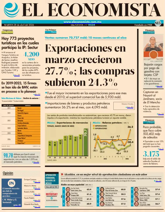 Exportaciones mexicanas aumentaron 27.7% en marzo impulsadas por los electrónicos México aumentó sus exportaciones a una tasa interanual de 27.7% en marzo, hasta 70,727 millones de dólares. México aumentó sus exportaciones a una tasa interanual de 27.7% en marzo, hasta 70,727 millones de dólares, impulsadas por las ventas manufactureras no automotrices, principalmente de productos eléctricos y electrónicos, informó este lunes el Inegi. Con este resultado, las ventas externas mexicanas acumularon 10 meses de aumentos anuales continuos, seis de ellos a tasas de doble dígito, y lograron su mayor dinamismo desde marzo de 2022. https://www.eleconomista.com.mx/empresas/exportaciones-mexicanas-amentaron-27-7-marzo-impulsadas-electronicos-20260427-810655.html |