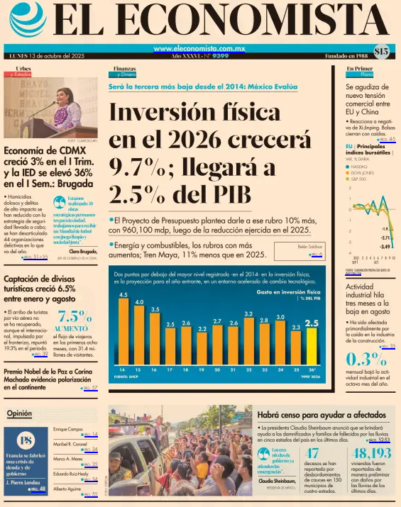 EL ECONOMISTAInversión física aumentaría 9.7% en el 2026; representaría 2.5% del PIB Para el siguiente año se plantea que de 24 funciones del gasto, 21 tengan incrementos y solo tres recortes, desde las 19 funciones que vieron menos recursos este año. Luego de que este año el gobierno federal decidiera pasarle tijera al gasto en inversión física para lograr la consolidación fiscal, para el 2026 propone revertir esto y destinar mayores recursos al rubro, aunque incluso así continuará por debajo del máximo histórico que se alcanzó en el 2014, esto de acuerdo con un análisis de México Evalúa. El Proyecto de Presupuesto de Egresos de la Federación (PPEF) propone que para el siguiente año, el gasto en inversión física sea de 960,100 millones de pesos que, de ser aprobado por la Cámara de Diputados, representaría un crecimiento de 10% en comparación con lo aprobado para este año. https://www.eleconomista.com.mx/economia/inversion-fisica-aumentaria-9-7-2026-representaria-2-5-pib-20251012-781230.html |