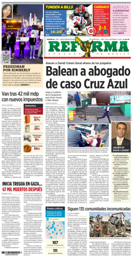 REFORMABalean a abogado de caso Cruz Azul David Cohen Sacal, abogado que representó a Víctor Garcés y a Guillermo "Billy" Álvarez Cuevas, ex directivos de la cooperativa Cruz Azul, fue baleado ayer por la tarde al salir de los juzgados del Poder Judicial en la Colonia Doctores, Alcaldía Cuauhtémoc de la CDMX. https://www.reforma.com/balean-a-abogado-de-caso-cruz-azul/ar3088802?v=3 |
