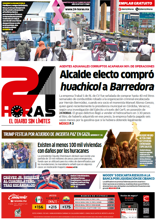24 HORASEdil electo de Córdoba vinculado a compra de huachicol de La Barredora La empresa Trabal S de RL de CV está señalada de comprar hasta 40 mil litros semanales de combustible robado (huachicol) a La Barredora, cuando uno de sus socios era Manuel Alonso Cerezo, alcalde electo de Morena en Córdoba, Veracruz, de acuerdo con una investigación del Ejército a través del Centro Regional de Fusión de Inteligencia (Cerfi). La organización criminal llegó a vender el combustible en 3.30 pesos el litro; de haberlo adquirido en ese precio, en 2021 la empresa habría pagado seis veces menos por la gasolina que si la hubiera adquirido de forma legal. https://24-horas.mx/mexico/edil-electo-de-cordoba-vinculado-a-compra-de-huachicol-de-la-barredora/ |