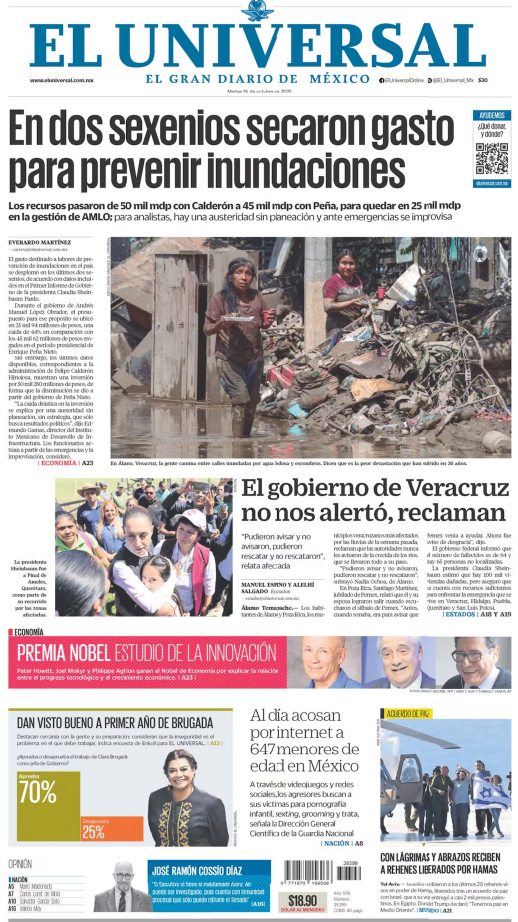 EL UNIVERSALEn dos sexenios secaron gasto para prevenir inundaciones Los recursos pasaron de 50 mil mdp con Calderón a 45 mil mdp con Peña, para quedar en 25 mil mdp en la gestión de AMLO; para analistas, hay austeridad sin planeación y ante emergencias se improvisa La inversión ejercida para prevenir inundaciones se redujo drásticamente durante los últimos dos sexenios, de acuerdo con estadísticas del Primer Informe de Gobierno de la presidenta Claudia Sheinbaum Pardo. En el sexenio de Andrés Manuel López Obrador, de 2019 a 2024, los recursos destinados a ese propósito totalizaron 25 mil 94 millones de pesos, 44% menos que durante el gobierno de Enrique Peña Nieto, cuando lo ejercido ascendió a 45 mil 62 millones de pesos. Sin embargo, durante el periodo presidencial de Felipe Calderón Hinojosa, últimos datos disponibles, la inversión fue de 50 mil 280 millones de pesos. https://www.eluniversal.com.mx/cartera/en-dos-sexenios-secaron-gasto-para-prevenir-inundaciones/ |