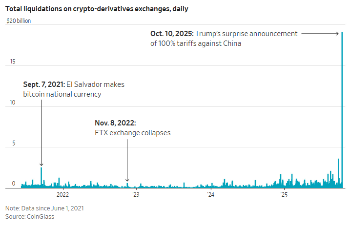 THE WALL STREET JOURNALUna ola de ventas de criptomonedas borró más de 19 mil millones de dólares, pero dos cuentas generaron 160 millones Antes de la ola de ventas, dos cuentas en Hyperliquid apostaron fuertemente a que Bitcoin y Ether caerían. El sorpresivo anuncio del presidente Trump de aranceles del 100% contra China el viernes desencadenó una ola de ventas de criptomonedas que eliminó más de $19 mil millones en posiciones apalancadas. Dos cuentas que apostaron contra el mercado minutos antes de la noticia obtuvieron una ganancia inesperada de $160 millones. Bitcoin cayó un 12%, forzando liquidaciones que desencadenaron aún más ventas, presionando los precios a la baja. Los tokens menos populares experimentaron caídas de hasta el 80%. CoinGlass, una plataforma de datos de criptomonedas, señaló que es probable que la magnitud de la ola de ventas esté subestimada, ya que muchas plataformas no publican datos de liquidación. https://www.wsj.com/finance/currencies/a-historic-crypto-selloff-erased-over-19-billion-but-two-accounts-made-160-million-3144cccd?mod=hp_lead_pos3 |