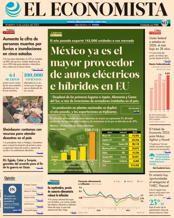EL ECONOMISTAMéxico toma el primer lugar en envíos de autos eléctricos a EU México desplazó a Japón, Corea del Sur y Alemania y se convirtió en el principal proveedor de vehículos eléctricos a Estados Unidos, al enviar 145,000 unidades durante el 2024, destacó el tercer Informe de Movilidad de México de EvolvX, realizado por Latam Mobility. México desplazó a Japón, Corea del Sur y Alemania y se convirtió en el principal proveedor de vehículos eléctricos a Estados Unidos, al enviar 145,000 unidades durante el 2024, destacó el tercer Informe de Movilidad de México de EvolvX, realizado por Latam Mobility. México no sólo duplicó su producción de vehículos eléctricos (VE) en 2024, alcanzando 220,000 unidades, sino que también se convirtió en el mayor proveedor de Estados Unidos, con 145,000 unidades, afirmó Rebeca González, cofundadora de Latam Mobility. https://www.eleconomista.com.mx/empresas/mexico-rebasa-japon-corea-sur-alemania-mayor-exportador-autos-electricos-eu-20251013-781330.html |