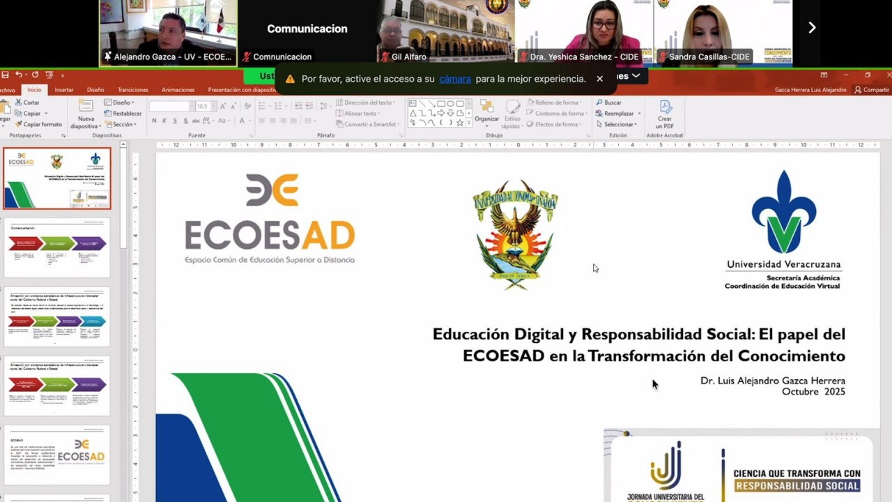 Se suma el CIDE a la Jornada Universitaria del Conocimiento UAS 2025 reflexionando sobre el papel de la educación a distancia El Centro de Innovación y Desarrollo Educativo (CIDE) se sumó a la Jornada Universitaria del Conocimiento UAS 2025, evento que promueve la Universidad Autónoma de Sinaloa (UAS) a través de la Dirección General de Investigación y Posgrado, con el objetivo de seguir difundiendo del quehacer científico universitario y fomentar el interés por la investigación entre los estudiantes. Al poner en marcha los trabajos académicos desarrollados en modalidad virtual, el director del CIDE, el doctor Martín Pastor Angulo, destacó la importancia de crear estos espacios de divulgación, reflexión y aprendizaje que representan una valiosa oportunidad para compartir la producción científica, académica y formativa que impulsa la universidad con un enfoque de responsabilidad social, inclusión e innovación educativa. Luego de la declaratoria inaugural se dio paso a la conferencia magistral “Educación Digital y Responsabilidad Social: el papel del ECOESAD en la transformación del conocimiento”, a cargo del doctor Luis Alejandro Gazca Herrera, coordinador de Educación Virtual de la Universidad Veracruzana y presidente del ECOESAD, quien compartió que la educación a distancia representa un beneficio para aquellas personas que por alguna cuestión no pueden asistir a la clase convencional, siendo también una respuesta a la necesidad de ampliar el acceso educativo. “La responsabilidad que nosotros tenemos en cuanto a esta transformación del conocimiento ya como instituciones de educación superior y cómo es que la política educativa nacional está enfocada hacia estos aspectos y modalidades educativas que nos permitan, reitero, ampliar nuestra cobertura, pero bajo unos criterios que tienen que ver con la cuestión de accesibilidad, de equidad, de transformación digital para que, más personas puedan incorporarse a estas modalidades educativas”, expuso. Cabe decir que el CIDE llevará a cabo esta jornada durante cuatro días en el que se desarrollarán una serie de actividades entre conferencias, conversatorios y paneles buscando fortalecer la formación docente y promoviendo la innovación educativa de acuerdo con los principios del Modelo Educativo UAS 2022 y el Plan de Desarrollo Institucional Con Visión de Futuro 2029. |