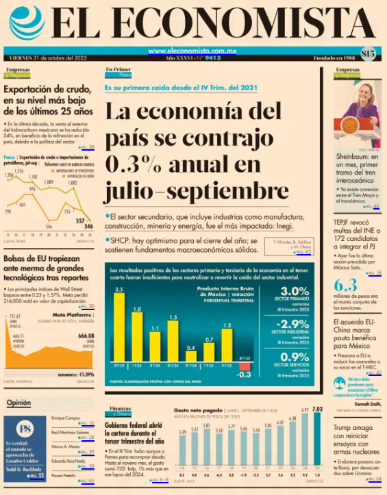 PIB cayó 0.3% anual en el III Trim; industria se desplomó 2.9% Las actividades terciarias, de servicios y comercio, se expandieron 0.9% y las primarias 3%, ambas a tasa anual. La economía mexicana presentó una contracción anual de 0.3% en el tercer trimestre del año, con cifras desestacionalizadas, según la estimación oportuna del Producto Interno Bruto (PIB) del Instituto Nacional de Estadística y Geografía (Inegi). De confirmarse el dato en el PIB final, que se dará a conocer el 21 de noviembre, se presentará la primera caída a tasa anual de la actividad económica, desde el cuarto trimestre del 2021. https://www.eleconomista.com.mx/economia/pib-cayo-0-3-anual-iii-trim-industria-desplomo-2-20251030-784416.html |