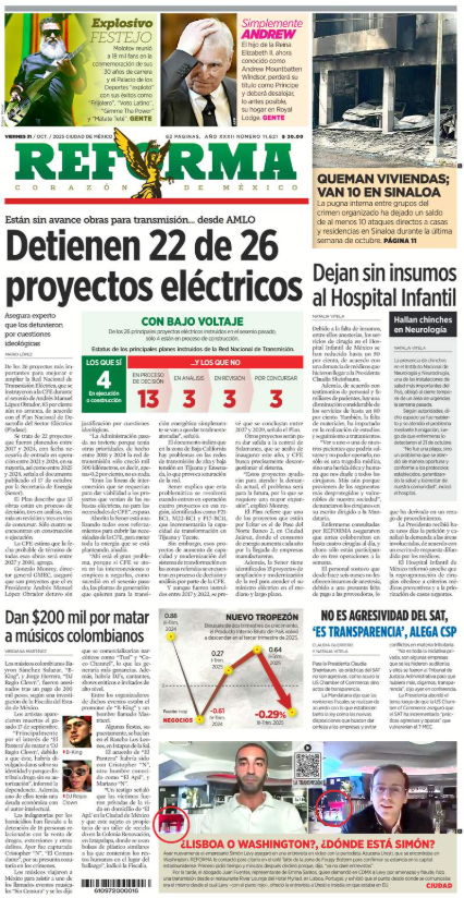Detienen 22 de 26 proyectos eléctricos De los 26 proyectos más importantes para mejorar o ampliar la Red Nacional de Transmisión Eléctrica, que se instruyeron a la CFE durante el sexenio de Andrés Manuel López Obrador, 85 por ciento aún no arranca, de acuerdo con el Plan Nacional de Desarrollo del Sector Eléctrico (Pladase). https://www.reforma.com/detienen-22-de-26-proyectos-electricos/ar3098722?v=3 |
