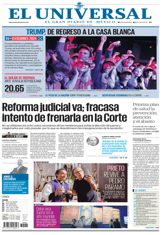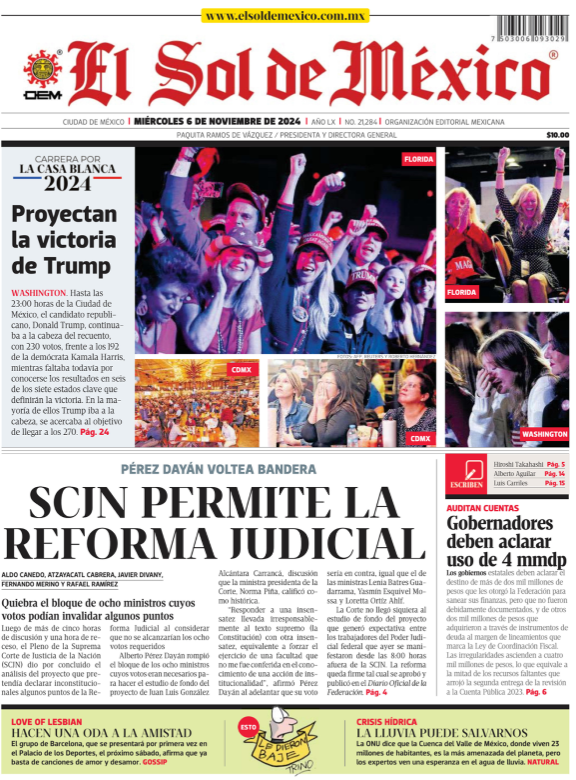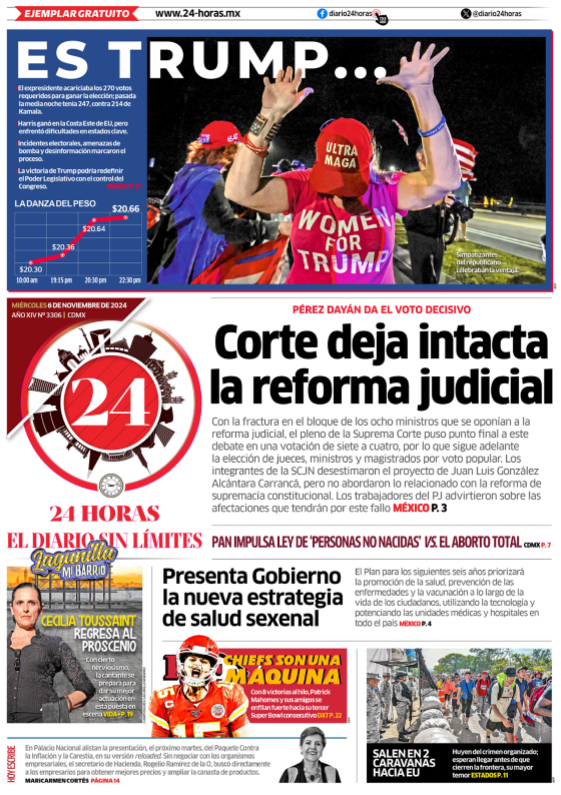 TRASCENDIÓ (MILENIO)Que poco después de las nueve de la noche hora de México, el dueño de la red social X, Elon Musk, decretó con la fórmula tenística “game, set and match”, es decir, juego, set y partido, la victoria de Donald Trump en la elección estadunidense, después de meses de hacer campaña abierta por el republicano y de haber recibido la oferta del magnate para ocupar un cargo clave. Ya para entonces el New York Times proyectaba una posibilidad de 89 por ciento contra la demócrata Kamala Harris. Que no fue el día de la presidenta de la Suprema Corte, Norma Piña, quien perdedora en las dos votaciones de ayer en el pleno, y cuando aún no digería el “fallo” de Miguel Ángel Yunes, perdón, Alberto Pérez Dayán, en favor de las tres ministras cuatroteístas, tuvo que llamar al orden porque precisamente ese trío comenzó a despedirse cuando aún no acababa de forma oficial la sesión e incluso una feliz Lenia Batres preguntó, aprovechando su primer momento de gloria desde que llegó al tribunal, si ya se podían retirar. Bueno. Que los efectos por el voto fantasma del legislador morenista Pedro Haces a favor de la reforma en materia de “supremacía constitucional” siguen escalando en el Palacio de San Lázaro y ya no solo la oposición cuestiona y exige esclarecer el asunto, sino diputados guindas, como Leonel Godoy y Manuel Espino, exigen ahora la renuncia de su correligionario a la “coordinación operativa” de la bancada, mientras él dice a quienes quieren escucharlo “no me voy, no me voy”. Ante una oposición borrada, ahora hasta en la Suprema Corte, afloran los ajustes internos de cuentas. Que la jefa de Gobierno de Ciudad de México, Clara Brugada, ya dio pie a que el encargado de despacho de la Fiscalía General de Justicia, Ulises Lara López, pueda formar parte de su gabinete en caso de que no sea electo como titular de la dependencia para el próximo periodo. Este martes, en conferencia de prensa, la mandataria destacó el trabajo del flamante licenciado en derecho, por lo cual dijo que sería una gran suma para su administración. |