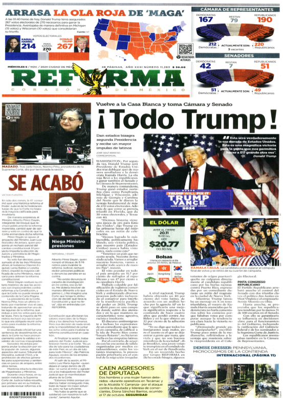 ¡Todo Trump! Por segunda vez, Donald Trump será Presidente de Estados Unidos tras doblegar ayer de manera arrolladora a la demócrata Kamala Harris. La ola roja llevó a los republicanos a ganar también el Senado y la Cámara de Representantes. https://www.reforma.com/todo-trump/ar2902305?v=6 |