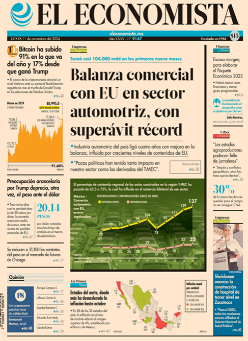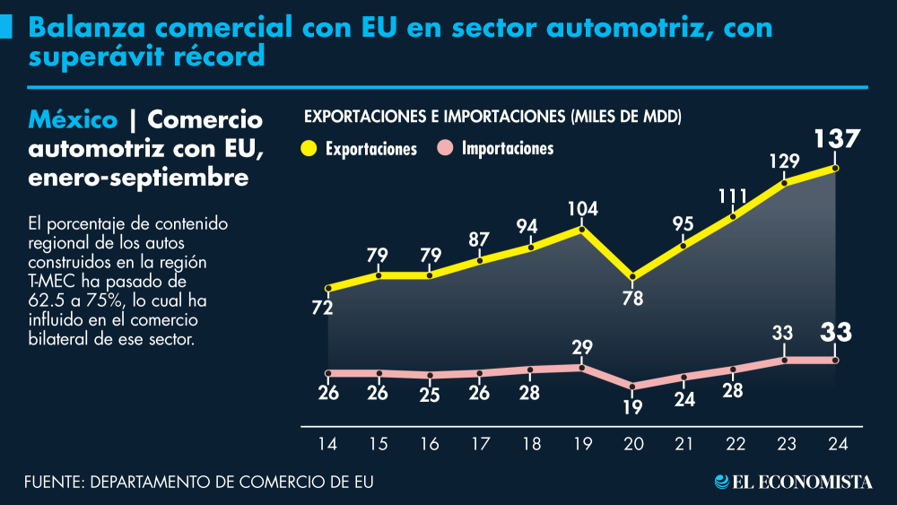 México logra superávit automotor récord con EU El saldo a favor de nuestro país durante el período ascendió a 103,977 millones de dólares, pero GM, Ford y Stellantis, consideran que la brecha esconde detrás un alto contenido estadounidense en las exportaciones mexicanas. México alcanzó superávit récord en su balanza comercial automotriz con Estados Unidos de enero a septiembre de 2024, a 103,977 millones de dólares, de acuerdo con datos del Departamento de Comercio. Con excepción de 2020, cuando ocurrió la mayor afectación de la pandemia de Covid-19, este superávit escaló año tras año en la última década.En el lapso correspondiente a 2024 fue la primera ocasión que el saldo positivo superó los 100,000 millones de dólares. https://www.eleconomista.com.mx/empresas/mexico-logra-superavit-automotor-record-eu-20241110-733650.html |