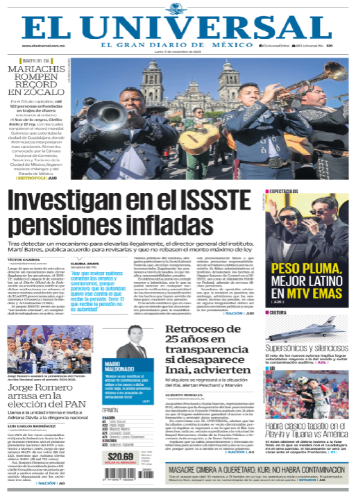 Investigan en el ISSSTE pensiones infladas El instituto inicia revisión de los pagos para corregir excesos que rebasan el monto máximo establecido por la ley de 32 mil 571 pesos mensuales, advierte Martí Batres https://www.eluniversal.com.mx/nacion/investigan-en-el-issste-pensiones-infladas/ |