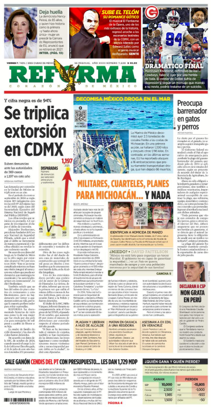 Se triplica extorsión en CDMX En periodo de enero a septiembre de 2024 se registraron 369 indagatorias por extorsión en CDMX, contra las 1,197 del mismo lapso de 2025. https://www.reforma.com/se-triplica-extorsion-en-cdmx/ar3102549?v=3 |