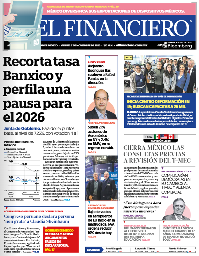 Banxico recorta la tasa y perfila pausa para 2026 El banco central consideró en su decisión el comportamiento del tipo de cambio, la debilidad que ha mostrado la economía, y los posibles impactos ante cambios en políticas comerciales a nivel global. La Junta de Gobierno del Banco de México (Banxico) determinó, por mayoría, reducir la tasa de interés en un cuarto de punto, por tercera ocasión consecutiva, para dejarla en 7.25 por ciento. Además, adelantó que hacia delante valorará recortar el referencial. Esto representó un cambio en la guía prospectiva, ya que antes señalaba “recortes adicionales”, lo que dividió a los analistas. Hay quienes ven que a partir del próximo año se observaría una pausa en la flexibilización monetaria iniciada en 2024, mientras que otros prevén que solo un choque inesperado frenaría el ciclo. https://www.elfinanciero.com.mx/economia/2025/11/07/banxico-recorta-la-tasa-y-perfila-pausa-para-2026/ |