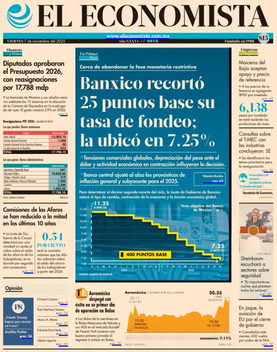 Banxico aplica nuevo recorte de 25 puntos base a la tasa de interés y la deja en 7.25% El Banco de México redujo este jueves su tasa de interés clave en 25 puntos básicos, como anticipaba el mercado, para llevarla a un 7.25 por ciento. La Junta de Gobierno de Banco de México aplicó un nuevo recorte de 25 puntos base en la tasa de fondeo, para llevarla a 7.25% en el penúltimo anuncio monetario programado del año, tal como anticipó el mercado consultado por Citi. En una decisión tomada por mayoría de cuatro a uno, con la oposición de nuevo del subgobernador Jonathan Heath, el banco central acumula una reducción de la tasa de 400 puntos base que ha realizado en 12 movimientos: ocho de ellos de un cuarto de punto cada uno y cuatro más de 50 puntos base. https://www.eleconomista.com.mx/sectorfinanciero/banxico-recorta-25-puntos-base-tasa-interes-dejarla-7-20251106-785382.html |