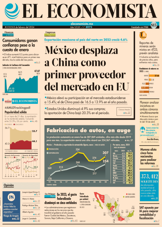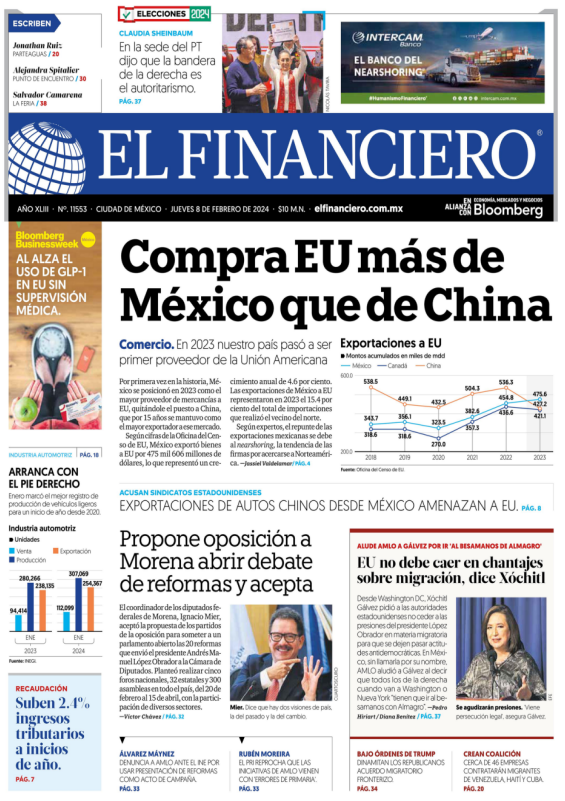 El ‘águila’ destrona al ‘dragón’: México vence a China y lideró exportaciones a EU en 2023 Las exportaciones mexicanas a EU representaron 15.4% del total de mercancías, según datos de la Oficina del Censo de EU. Por primera vez en la historia, México fue el mayor proveedor de mercancías a Estados Unidos, quitándole ese puesto a China en 2023, luego de que durante 15 años el ‘dragón asiático’ se sostuvo como el mayor exportador al mercado norteamericano. De acuerdo con cifras de la Oficina del Censo de EU, México exportó bienes a Estados Unidos por 475 mil 606 millones de dólares, lo cual representó un crecimiento anual de 4.6 por ciento. Las exportaciones mexicanasal vecino del norte representaron 15.4 por ciento del total de mercancías que Estados Unidos compró a sus socios comerciales. https://www.elfinanciero.com.mx/economia/2024/02/07/mexico-vence-a-china-fue-el-pais-que-mas-mercancias-exporto-a-eu-en-2023/ |