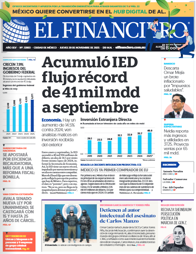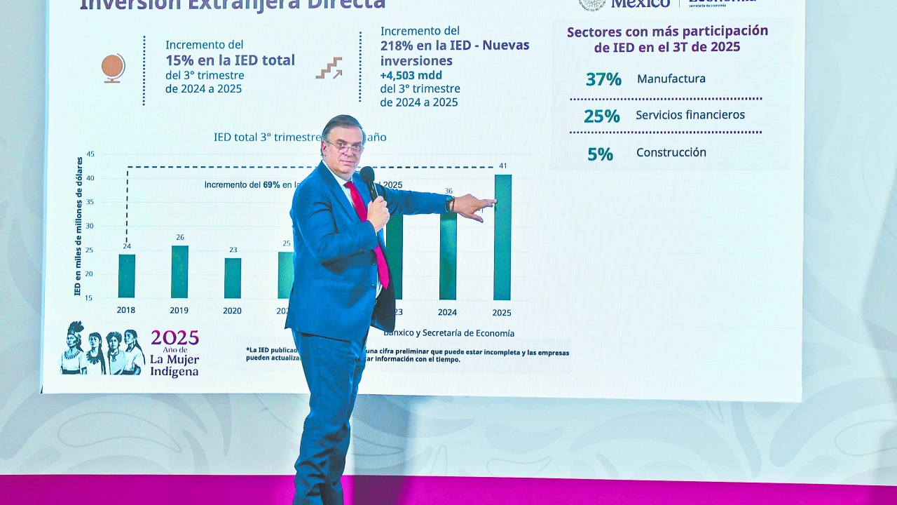 Acumula IED 41 mil mdd a septiembre y marca récord La Secretaría de Economía destacó un repunte en las nuevas inversiones en el país, así como cuentas entre compañías. Entre enero y septiembre de 2025 la Inversión Extranjera Directa (IED) ascendió a 40 mil 906 millones de dólares (mdd), un incremento anual de 14.5 por ciento frente a los 35 mil 737 mdd registrados en el mismo lapso de 2024, informó la Secretaría de Economía. Con ello, el país establece un nuevo récord histórico, impulsado por nuevas inversiones y un repunte de las cuentas entre compañías. https://www.elfinanciero.com.mx/economia/2025/11/20/acumula-ied-41-mil-mdd-a-septiembre-y-marca-record/ |