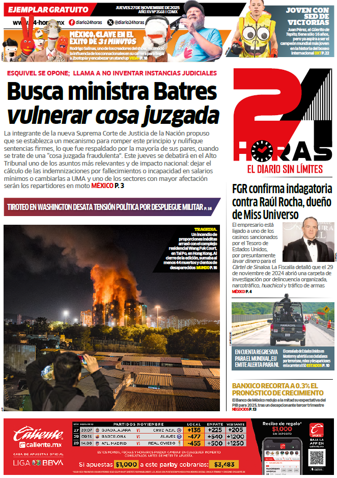 Lenia Batres abre puerta a tumbar casos y juzgados La ministra Lenia Batres propuso que la nueva Suprema Corte de Justicia de la Nación (SCJN) busque un mecanismo para romper el principio de “cosa juzgada” y nulificar sentencias firmes, respaldado por la mayoría de la Corte, con la oposición de Yasmín Esquivel. La mayoría de ministros respaldaron que se puedan someter a revisión sentencias firmes, cuando se trate de una "cosa juzgada fraudulenta". Durante la sesión de este miércoles, la discusión de un asunto sobre una mujer que demandó a su exesposo y a una empresa la nulidad de un juicio concluido por la simulación de un adeudo, sirvió para que los ministros fijarán sus posturas generales sobre el principio de cosa juzgada, mientras que se elaborará un nuevo proyecto de ese caso. https://24-horas.mx/mexico/lenia-batres-abre-puerta-a-tumbar-casos-y-juzgados/ |
