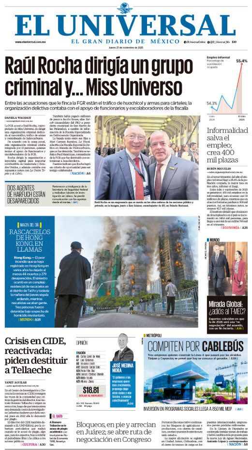 De distractor a bomba Raúl Rocha se convirtió en una pieza desechable para efectos de opinión pública, pero la filtración en sí misma, es un claro control de daños para dar oxígeno a Palacio Nacional, tiene alas para convertirse en un escándalo mayor. No podía haber caído en mejor momento para desviar la atención de las crisis múltiples que enfrenta la presidenta Claudia Sheinbaum: Raúl Rocha, a quien arrolla un huracán categoría 5 por la controversia internacional sobre la integridad del certamen Miss Universo, la Fiscalía General de la República decidió sacrificarlo para que se llevara los reflectores a otro lado. Abrió la caja del silencio y filtró a la prensa que le otorgaron un criterio de oportunidad para evitar ser procesado y encarcelado por los presuntos delitos de narcotráfico, tráfico de armas y contrabando de combustible. Rocha se fue a Tailandia a meterse en otro problema con el concurso y, de regreso a México, se encontró con que, aunque no iría a la cárcel, su fama pública había terminado de hacerse pedazos. Rocha se convirtió en una pieza desechable para efectos de opinión pública, pero la filtración en sí misma, un claro control de daños –se puede conjeturar–, para dar oxígeno a Palacio Nacional, tiene alas para convertirse en un escándalo mayor, como sucedió cuando, para apaciguar al presidente Donald Trump, la Marina se sacó de la manga una investigación sobre contrabando de combustible en Tamaulipas, que no sabía, ni tampoco la presidenta, que iba a escalar a las alturas del poder del régimen. La orden de aprehensión que solicitó la FGR menciona a una decena de personas que presuntamente operaron los delitos imputados, pero como subordinados de Rocha, o como Jacobo Reyes León, director de Seguridad de Acolman, un municipio mexiquense pegado a Ecatepec, a quien le pagaba, según el documento, por darle información de la FEMDO. El criterio de oportunidad exige que aporte información “esencial y eficaz” para la persecución de un delito más grave del que se le imputa, donde, por su naturaleza, no puede darla sobre personas subordinadas a quien lo obtiene, sino de aquellas que, por sus funciones, entran en el supuesto. Este es el punto donde el caso Rocha puede volverse, como el de los marinos involucrados en el huachicol fiscal, en un asunto tan caliente que la presidenta decida meter el freno y pararlo en un nivel que no permita escalar a alturas que comprometan al régimen. De acuerdo con reportes de inteligencia, Rocha tiene vínculos con el Grupo Virreyes, que está siendo investigado por la FGR porque una de sus empresas, Mada Energy, con sede en Querétaro, operaba gasolineras en Tamaulipas cuyo combustible compraba a pipas de origen desconocido, que vendía en 19 pesos el litro de gasolina regular, cuando en el mercado local el litro estaba en 21.69 pesos, poco después del aseguramiento de un barco con huachicol, que detonó la investigación con los marinos. El Grupo Virreyes, que encabeza Mario Giordano, tiene relaciones abiertas con el coordinador de Morena en el Senado, Adán Augusto López, y con el expresidente de Morena, Mario Delgado, quienes han sido señalados en investigaciones en México y Estados Unidos como parte de las redes del contrabando de combustible. Los reportes de inteligencia señalan que, además de Rocha, altos funcionarios en el gobierno del presidente Andrés Manuel López Obrador, que trabajaban con él en Palacio Nacional, también tenían una relación estrecha con ese grupo.La investigación, cuyos generales fueron publicados ayer en la prensa, se inició el 29 de noviembre del año pasado a partir de una denuncia anónima. Esa investigación derivó en la causa penal 307/2025 del 7 de agosto de este año, en la que la Fiscalía Especializada en materia de Delincuencia Organizada (FEMDO) solicitó una orden de aprehensión en contra de 13 personas, entre las que se encontraba Rocha, por los presuntos delitos de narcotráfico, tráfico de armas y contrabando de combustible. La jueza a la que le pidieron la orden de aprehensión, en el Estado de México, la rechazó por carecer de legal competencia por cuestiones de territorio –fuera de su jurisdicción– y de seguridad, porque las autoridades dijeron que los delitos se habían realizado en Querétaro y la Ciudad de México. La FEMDO llevó el caso a Querétaro, donde se abrió el 15 de noviembre la causa penal 495/2025, que es lo que se filtró a la prensa. En ella aparecen al menos ocho de las 13 personas imputadas en la causa penal inicial de agosto, en la que figuran la fiscal especial de Investigación de Delitos en Materia de Hidrocarburos, Mari Carmen Ramírez Rodríguez; el comandante de la FEMDO, Raúl Manrique Miranda, y una jueza federal, Elizabeth Muzquiz Pineda, adscrita a San Juan del Río, en Querétaro. No aparece en la orden que publicó la prensa Jorge Alberts Ponce, que sí figura en la causa penal del 6 de agosto. Alberts Ponce dirige una empresa que le daba servicio de vigilancia a Banobras en el sexenio pasado y es socio del Grupo Aura, donde cuatro de sus cinco accionistas están vinculados a una red de corrupción de Segalmex, de acuerdo con una investigación de Mexicanos Contra la Corrupción. Según lo que publicó la prensa, la denuncia anónima presentada en la FGR detonó la investigación el 29 de noviembre del año pasado, dos semanas después de que el gobernador de Tabasco, Javier May, dijo que sus predecesores Adán Augusto López y Carlos Merino, director de Aeropuertos y Servicios Auxiliares, “deberán responder por la violencia” en el estado. May inició una investigación contra La Barredora, que manejaba el exdirector de Seguridad del gobierno estatal, Hernán Bermúdez Requena, nombrado por el senador López, que era un brazo criminal del Cártel Jalisco Nueva Generación, y que operaba una ruta de contrabando de combustible desde la frontera con Guatemala hasta Tamaulipas. La denu