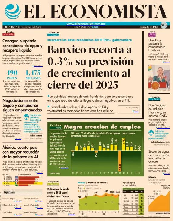 Banxico recorta a 0.3% su pronóstico de crecimiento para el PIB en 2025; reduce rango para 2026 El ajuste incorpora la contracción observada en la economía durante el tercer trimestre y no considera la posibilidad de otra caída. El Banco de México redujo su estimación media de crecimiento para el Producto Interno Bruto (PIB) de este año a 0.3% desde 0.6% que tenían a fines de agosto. El pronóstico, incorporado en su Informe Trimestral correspondiente al periodo julio a septiembre, la nueva proyección de crecimiento, es el punto medio de un rango estimado de que está entre 0.1 y 0.5 por ciento. https://www.eleconomista.com.mx/sectorfinanciero/banxico-recorta-0-3-pronostico-crecimiento-pib-2025-reduce-rango-20251126-788404.html |
