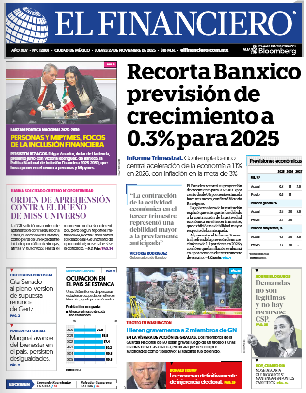Banxico recorta su proyección del PIB de 2025 a 0.3 por ciento: Victoria Rodríguez El ajuste del Banxico sobre la proyección del PIB de México se debe a la contracción de la actividad económica. El Banco de México (Banxico) recortó su proyección puntual de crecimiento para la economía mexicana en 2025 a 0.3 por ciento, desde 0.6 por ciento estimada hace tres meses, afirmó Victoria Rodríguez, gobernadora del banco central. La gobernadora de la institución explicó que este ajuste se debió a la contracción de la actividad económica del tercer trimestre del año, que exhibió una debilidad mayor, respecto de la anticipada. https://www.elfinanciero.com.mx/economia/2025/11/26/banxico-recorta-su-proyeccion-del-pib-de-2025-a-03-por-ciento-victoria-rodriguez/ |