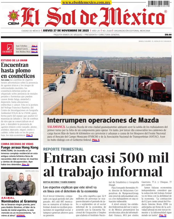 TRASCENDIÓ (MILENIO)Que aunque habían desdeñado el ofrecimiento de tener una reunión con el diputado Ricardo Monreal, los integrantes del Frente Nacional para el Rescate del Campo Mexicano finalmente sí asistieron a San Lázaro y al parecer este encuentro tuvo buenos resultados, pues consiguieron una mesa sobre la ley de aguas y, además, que legisladores del PT se conviertan en una especie de mediadores para retomar el diálogo con el gobierno federal que les permita alcanzar acuerdos y terminar con los bloqueos carreteros. A ver. Que con nada más que el sentido común, la presidenta Claudia Sheinbaum enmendó la plana a Gerardo Fernández Noroña, a quien pidió “sensibilidad” después que acusó a la alcaldesa de Uruapan, Grecia Quiroz, de ultraderechista, fascista y ambiciosa, y lo llamó a respetar y ser solidario frente al homicidio de Carlos Manzo, pues para lo político habrá otros momentos. Hubo, sin embargo, quienes dentro de Morena no coinciden con la mandataria, como Lucía Trasviña, quien se resistió a refutar a su compañero de bancada y salió, hágame usted favor, conque por qué nadie cuestiona a Lilly Téllez, emulando a su prócer con la famosa salida “¿y García Luna?”. Bueno. Que a pesar de que la ministra Lenia Batres celebró que la nueva Corte abriera la puerta a romper el principio de impunidad que había prevalecido en el Poder Judicial, al revisar casos considerados cosa juzgada, pero fraudulenta, no se alcanzó el respaldo de seis requerido para avalar el que sería un precedente para reabrir asuntos cuyas sentencias están firmes. Solo la acompañaron Sara Irene Herrerías, Loretta Ortiz, Irving Espinosa Betanzo y Hugo Aguilar. Que tras la apresurada discusión y votación en comisiones del proyecto de reformas a la Ley de Salud para prohibir vapeadores y cigarrillos electrónicos, la mayoría de Morena en la Cámara de Diputados desaceleró el avance del dictamen y, hasta bien avanzada la sesión de ayer en el pleno, la presidenta de la Mesa Directiva en San Lázaro, Kenia López, no había recibido el dictamen para darle trámite, por lo que se prevé sea aprobada hasta el martes. |
