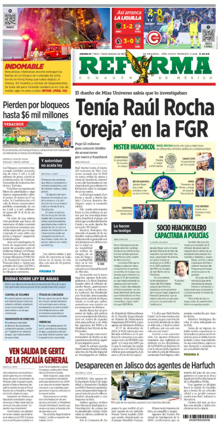Raúl Rocha dirigía un grupo criminal y Miss Universo Entre las acusaciones que le finca la FGR están el tráfico de huachicol y armas para cárteles; la organización delictiva contaba con el apoyo de funcionarios y excolaboradores de la fiscalía La Fiscalía General de la República (FGR) imputó aRaúl Rocha Cantú, copropietario de Miss Universo, por los probables ilícitos de delincuencia organizada con la finalidad de cometer delitos contra la salud en su modalidad de tráfico de narcóticos, tráfico de armas de fuego e hidrocarburos, al pertenecer a una organización criminal. El grupo delincuencial está integrado por 12 personas más y a Rocha Cantú se le acusa de dirigirlo, de dedicarse a inyectar recursos para el huachicol e incluso de prestar sus gasolinerías para lavar dinero, apoyado por funcionarios y exfuncionarios de la FGR. En la causa penal 495/2025 del 15 de noviembre de este año, se solicita librar una orden de aprehensión contra 13 personas identificadas como Jacobo Reyes León, alias Yaicob, El Lic o El Licenciado; Jorge Alberts Ponce o Jorge Enrique Alberts Ponce, alias Yoryi o Licenciado. https://www.eluniversal.com.mx/nacion/raul-rocha-dirigia-un-grupo-criminal-y-miss-universo/ |